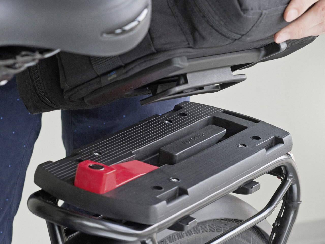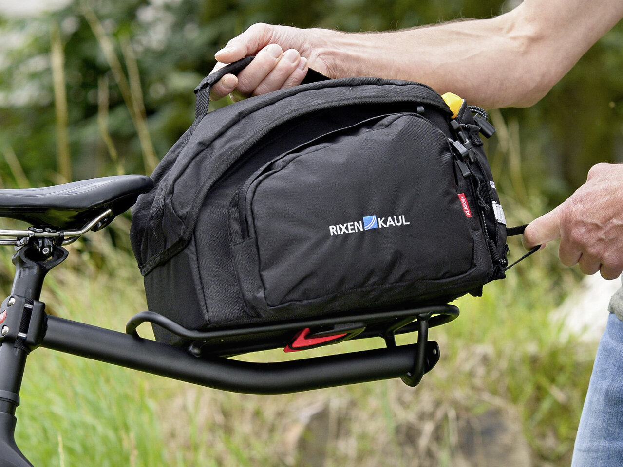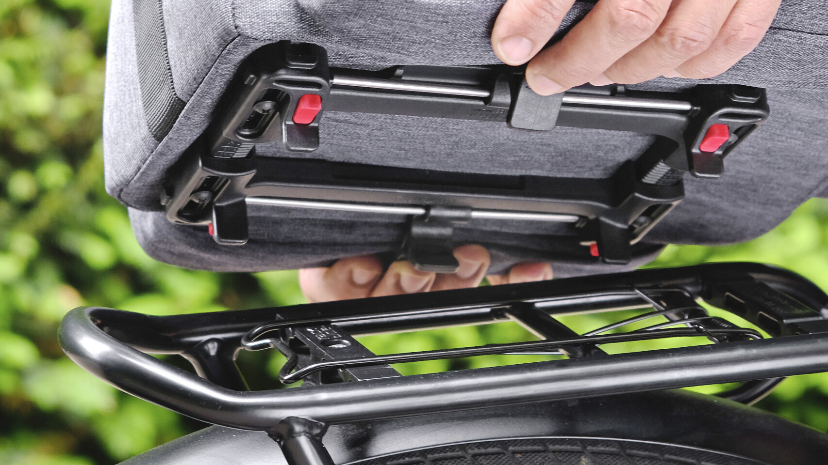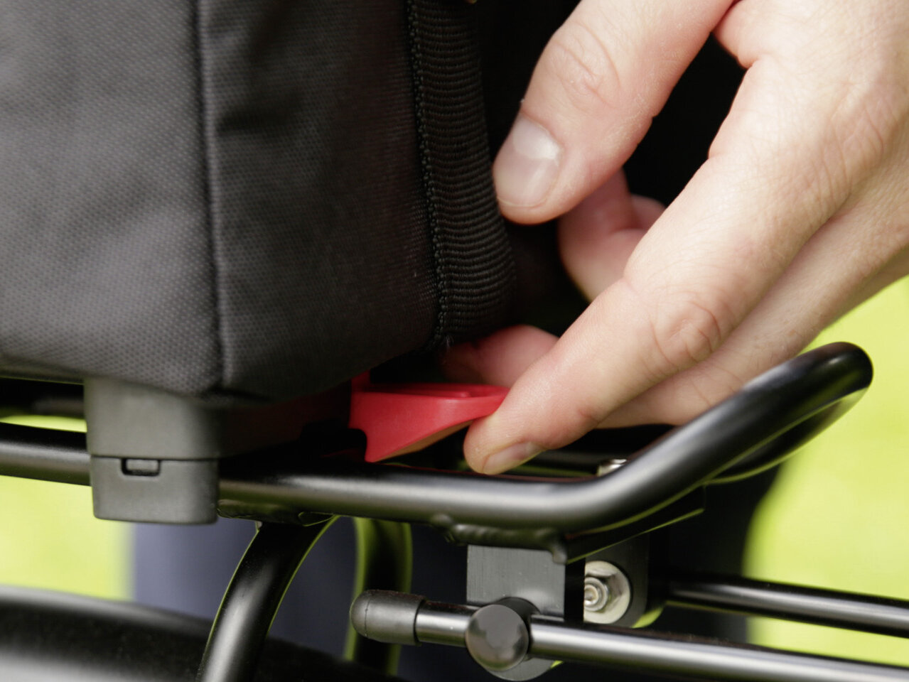 Tasche verriegelt automatisch beim Vorschieben an der Querstrebe des  Gepäckträgers. Zum Abnehmen einfach am Gurtband ziehen.