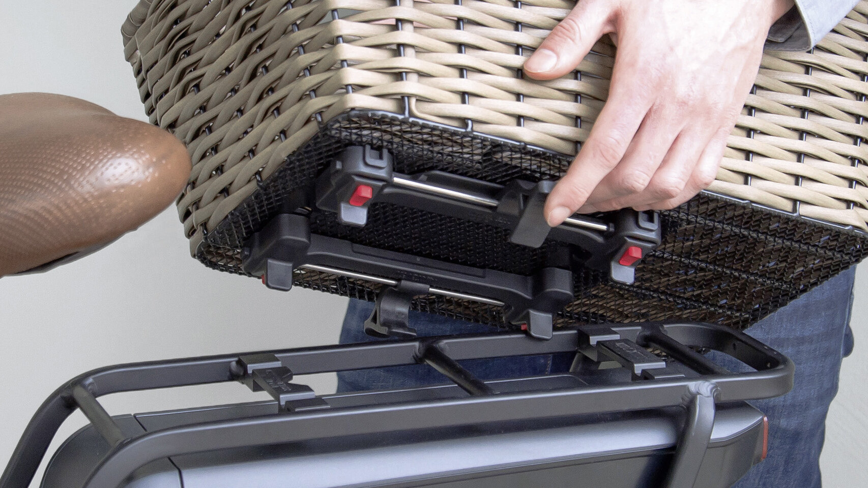 Zubehör auf den speziellen Racktime Träger setzen und zur automatischen Verriegelung nach vorne schieben.